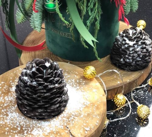 Monoporcje Granat i Świece Biszkopt Dacquoise malinowy Coulis granatowy Ganache ubijany malinowy Płynny insert granatowy Mus szampański Polewa czekoladowa Dekoracje…