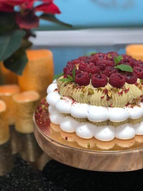 2 Rodzaje – Beza francuska klasyczna – Ganache pistacjowy (ubijany) – Nadzienie malinowe – Beza orzechowa…